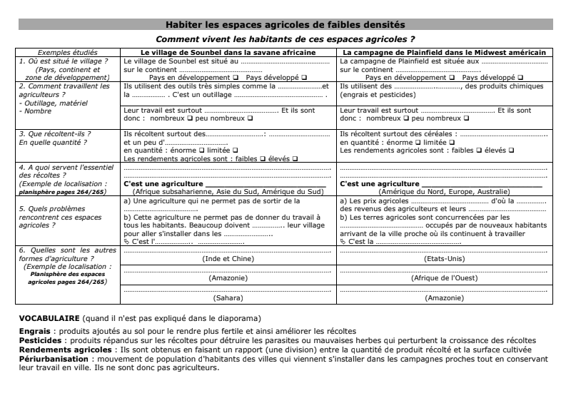 Leçon de conclusion afin de comparer les deux exemples étudiés, le village de Sounbel dans la savane africaine et la campagne de Plainfield dans le Midwest américain.