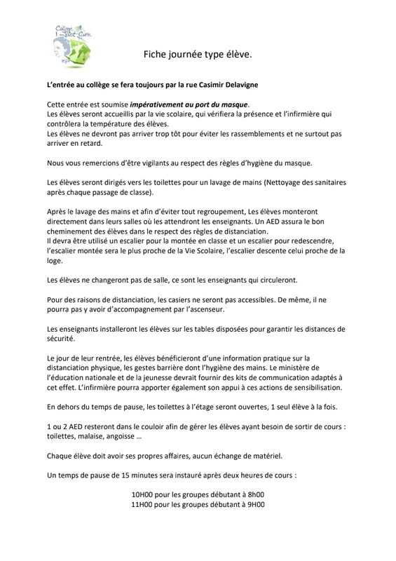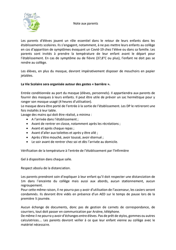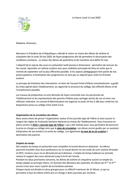 Tous les documents adressés aux familles afin de préparer au mieux le retour des élèves au collège :