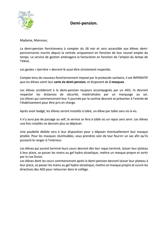 les modalités de la fin de l'année scolaire - la réorganisation de la demi-pension - la journée type de l'élève - le rôle des familles -